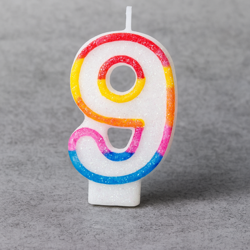 Празнична свещ за торта във формата на цифрата 9 в бял цвят с разноцветна рамка и блестящи частици брокат, която ще бъде цветно допълнение към всяко парти за рожден ден на дете.
