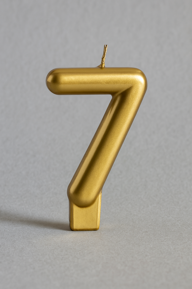 Празнична свещ за торта във формата на цифрата 7 в златист цвят, която ще бъде страхотно допълнение към всяко парти за рожден ден на дете.