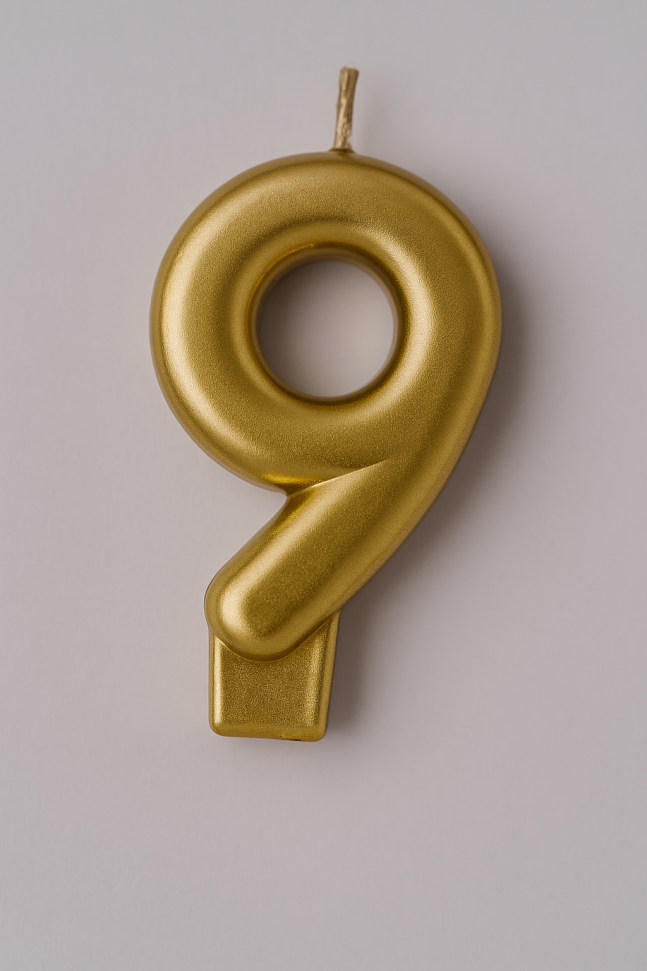 Празнична свещ за торта във формата на цифрата 9 в златист цвят, която ще бъде ефектно допълнение към всяко парти за рожден ден на дете.