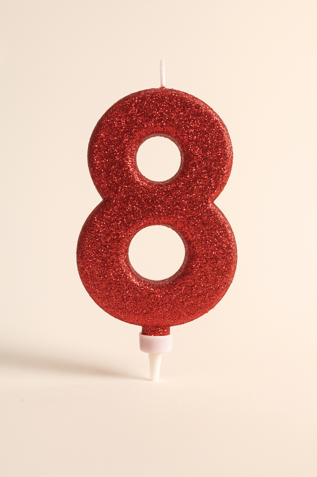 Празнична свещ с поставка за торта за торта във формата на цифрата 8 в червен цвят с блестящи частици брокат, която ще бъде страхотно допълнение към всяко парти за рожден ден на дете.