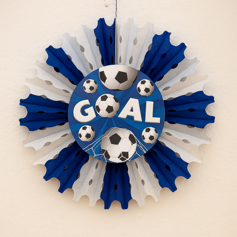 Парти декорация във формата на ветрило, изработена от хартия в синьо и бяло с картинки на футболни топки.