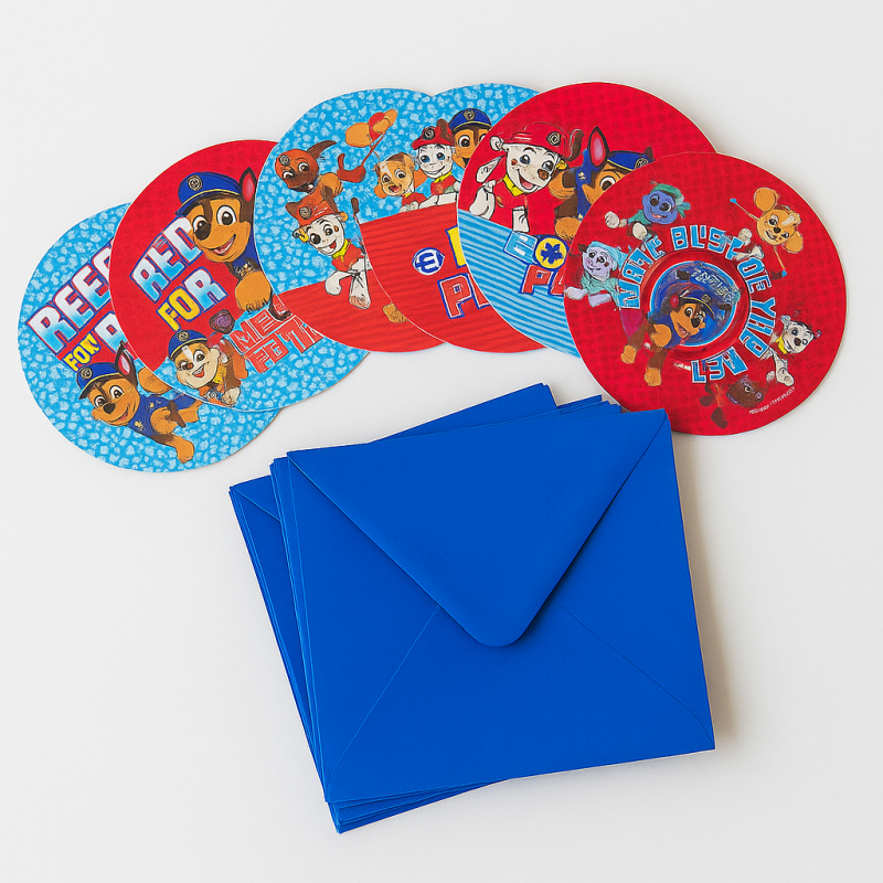 6 броя детски покани за рожден ден или детско парти с кръгла форма и различни картинки на героите от PAW PATROL в комплект с хартиени пликове в син цвят.