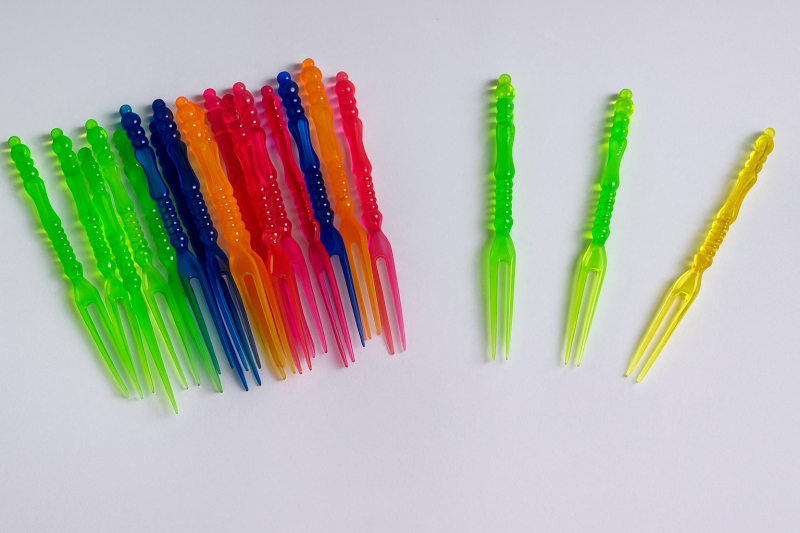 20 броя парти клечки във формата на вилички, изработени от пластмаса в различни ярки цветове.