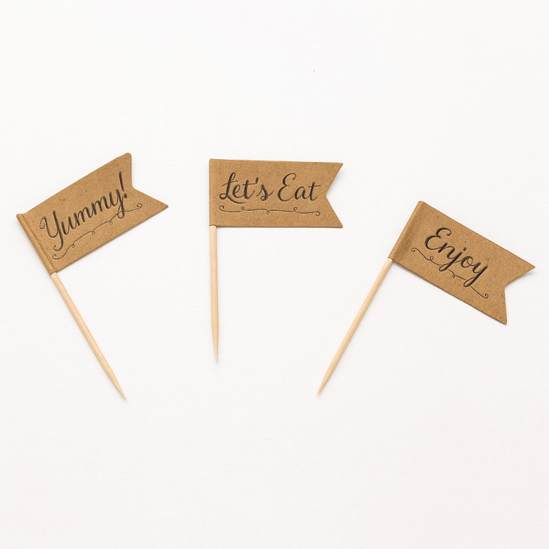 24 броя парти клечки във формата на кафяви флагчета с различни забавни и позитивни надписи, изработени от дърво и хартия.