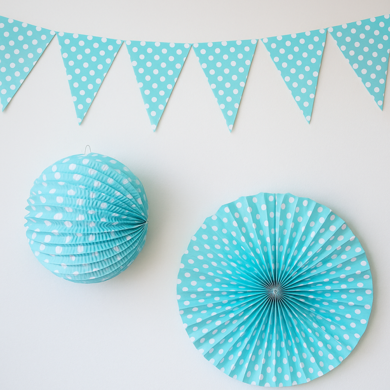 Комплект от 3 броя висящи парти декорации във формата на топка, ветрило и флагчета, изработени от хартия в светло син цвят.