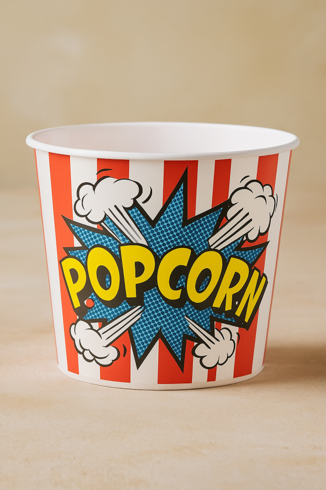 Парти купа за пуканки, изработена от картон в червено-бяло с тематичен надпис.