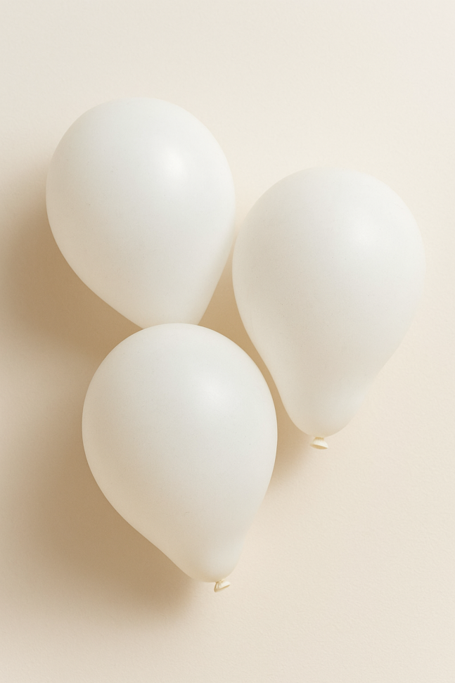 10 броя парти балони, изработени от траен каучук с класическа форма в бял цвят.