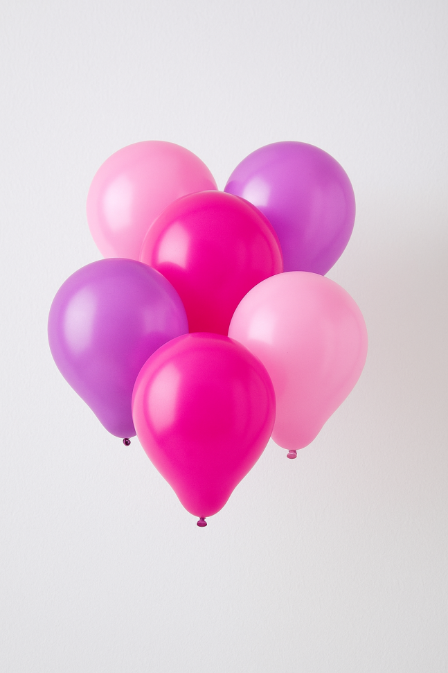 10 броя парти балони, изработени от траен каучук с класическа форма в три цвята - цикламени, лилави и розови.