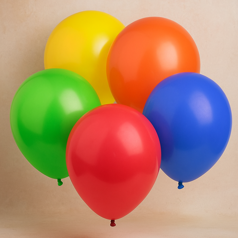 5 броя парти балони, изработени от траен каучук с класическа форма в различни ярки цветове - жълт, оранжев, зелен, син и червен.