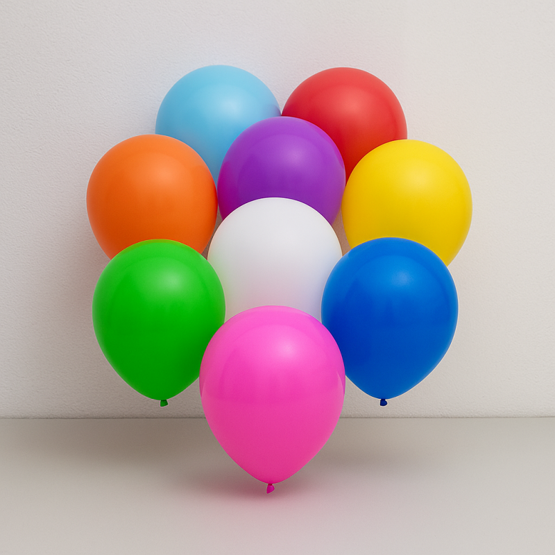 8 броя парти балони, изработени от траен каучук с класическа форма в различни ярки цветове.