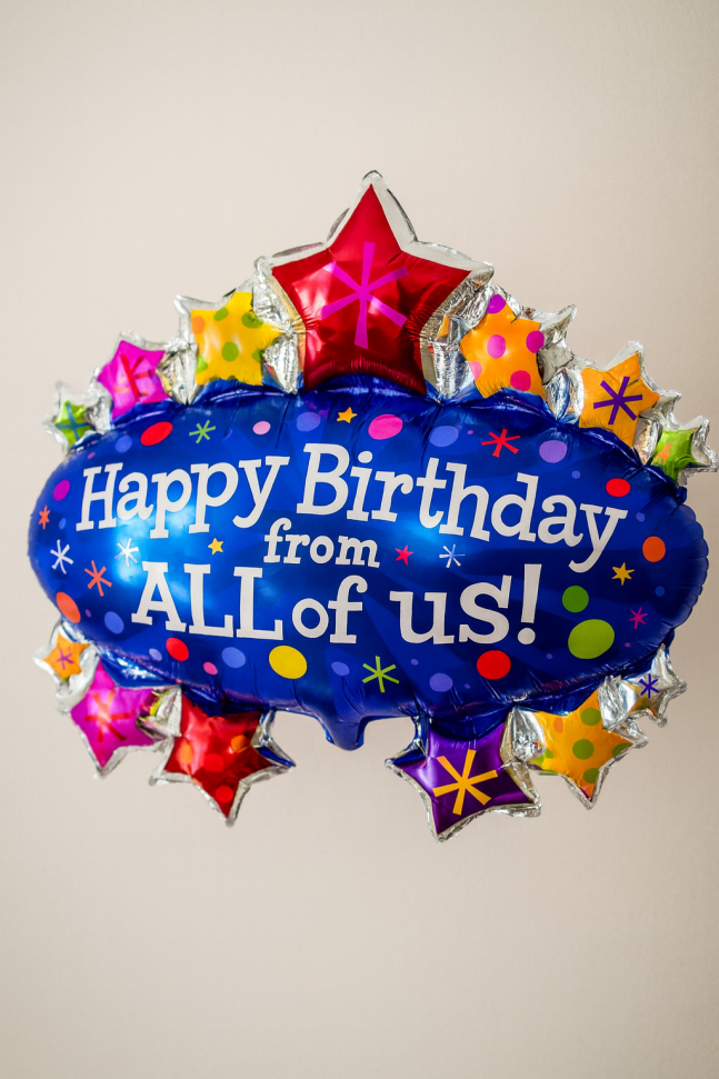 Парти балон, изработен от фолио с разноцветни звезди и надпис Happy Birthday.