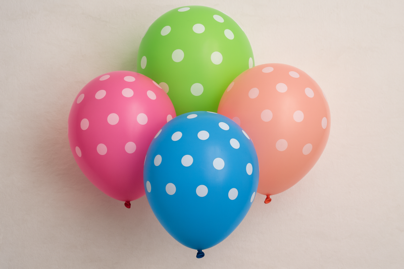10 броя парти балони, изработени от латекс в различни ярки цветове с принт на бели точки.