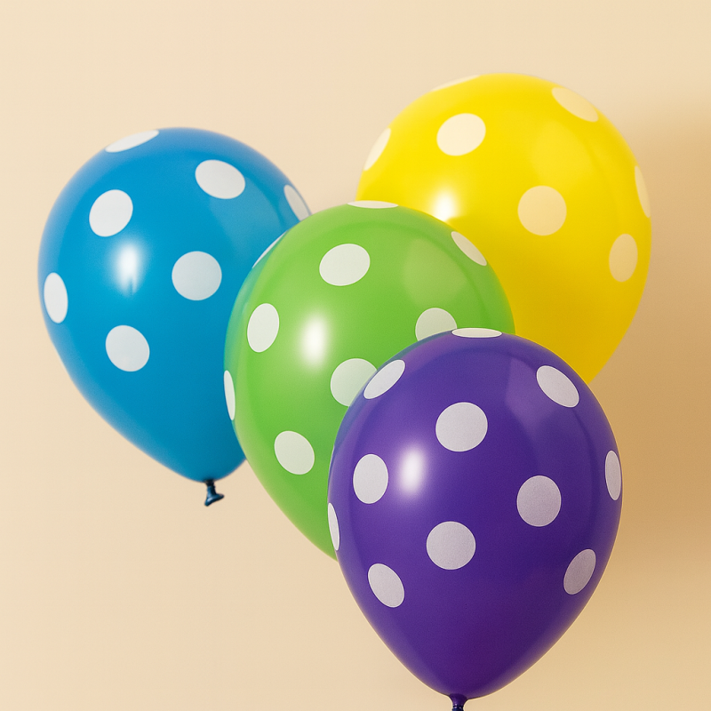 20 броя парти балони, изработени от латекс в 6 различни цвята с бели точки.