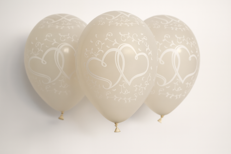 10 броя парти балони, изработени от прозрачен латекс с принт на бели сърца и декоративни орнаменти.