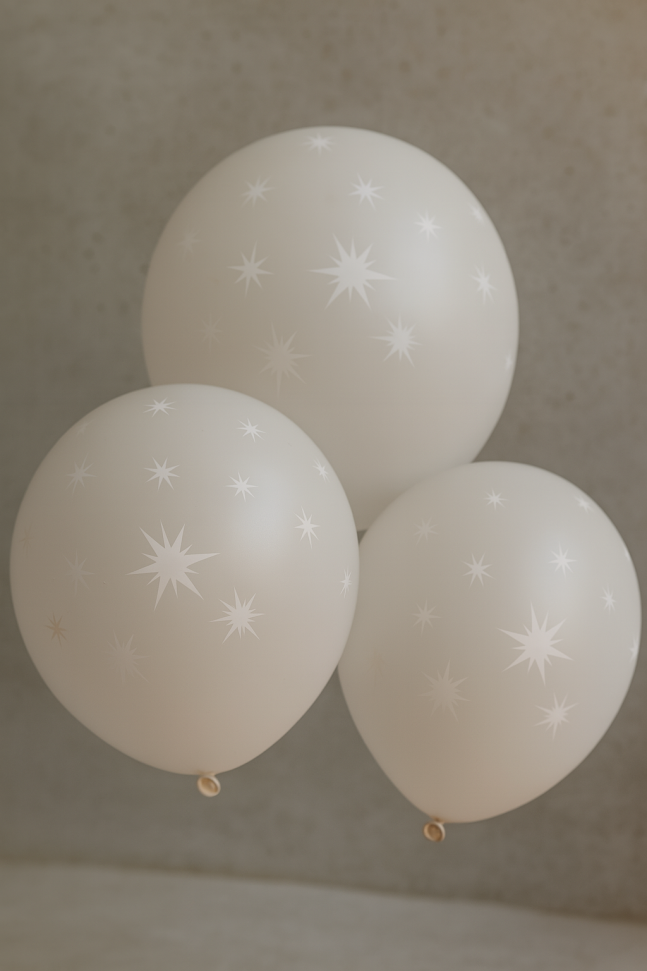 10 броя парти балони, изработени от латекс в цвят екрю с принт на бели звезди.