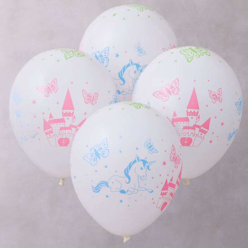 15 броя парти балони, изработени от латекс в бял цвят с красиви цветни картинки на приказен замък и еднорог.