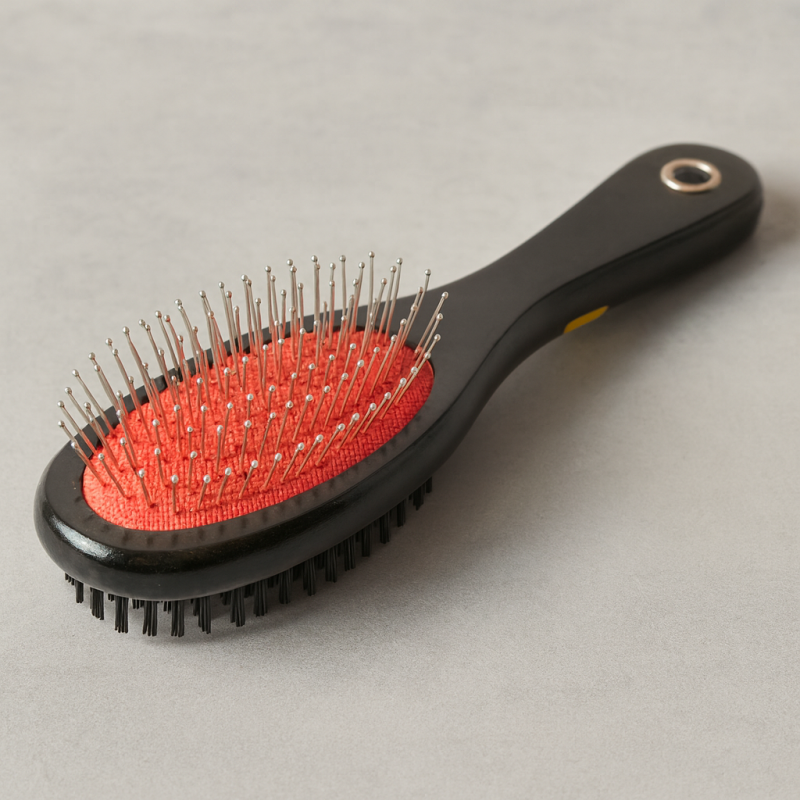 Четка за кучета с устойчива дръжка и две страни с различно покритие - за оптимално поддържане и лесно разресване на козината.