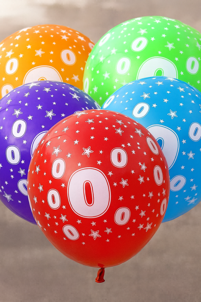5 броя парти балони, изработени от латекс в различни ярки цветове с щампа на цифрата 0.