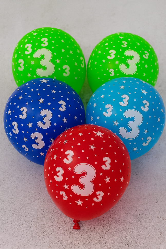 5 броя парти балони, изработени от латекс в различни наситени цветове с щампа на цифрата 3.