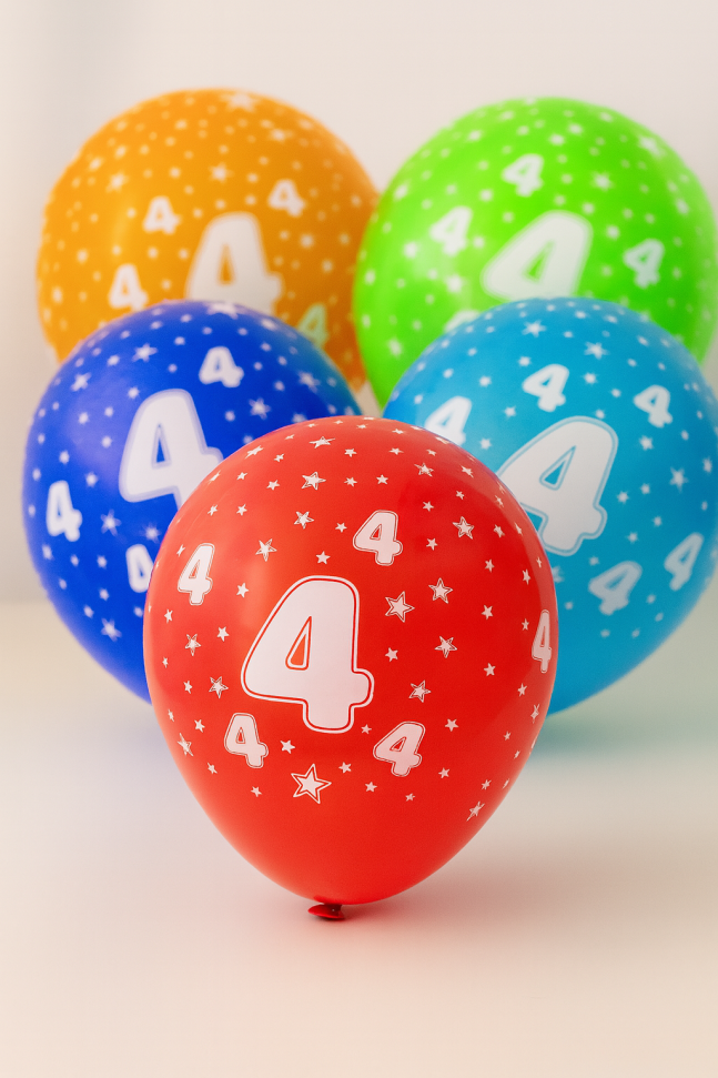 5 броя парти балони, изработени от латекс в различни ярки цветове с щампа на цифрата 4.