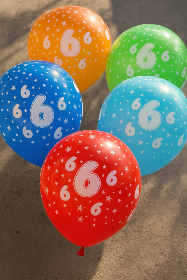 5 броя парти балони, изработени от латекс в различни ярки цветове с щампа на цифрата 6.