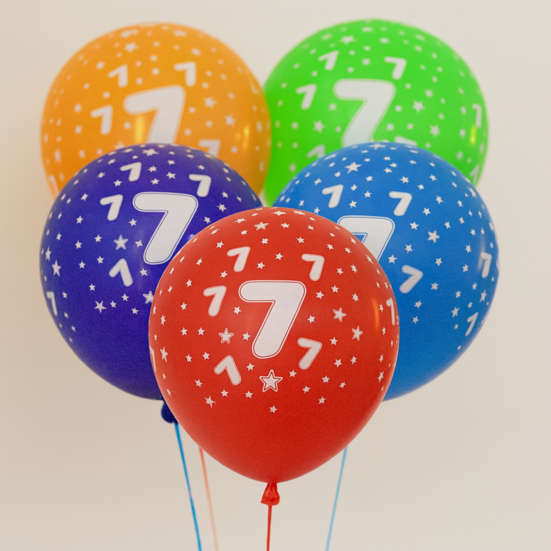 5 броя парти балони, изработени от латекс в различни наситени цветове с щампа на цифрата 7.