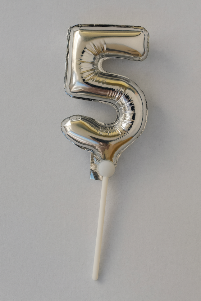 Парти балон, изработен от фолио във формата на цифрата 5 в сребрист цвят.