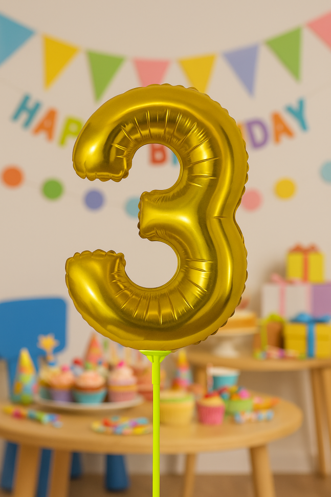 Парти балон, изработен от фолио във формата на цифрата 3 в златист цвят.