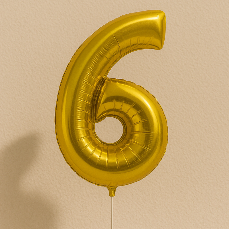 Парти балон, изработен от фолио във формата на цифрата 6 в златист цвят.