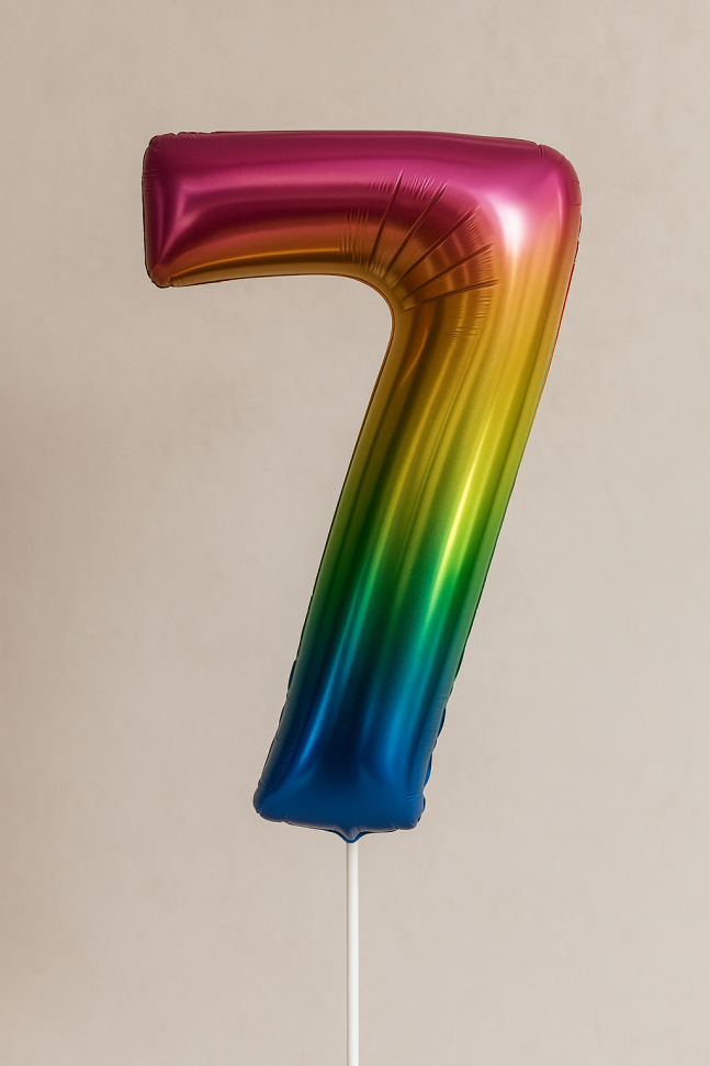 Голям парти балон, изработен от фолио във формата на цифрата 7 в цветовете на дъгата.