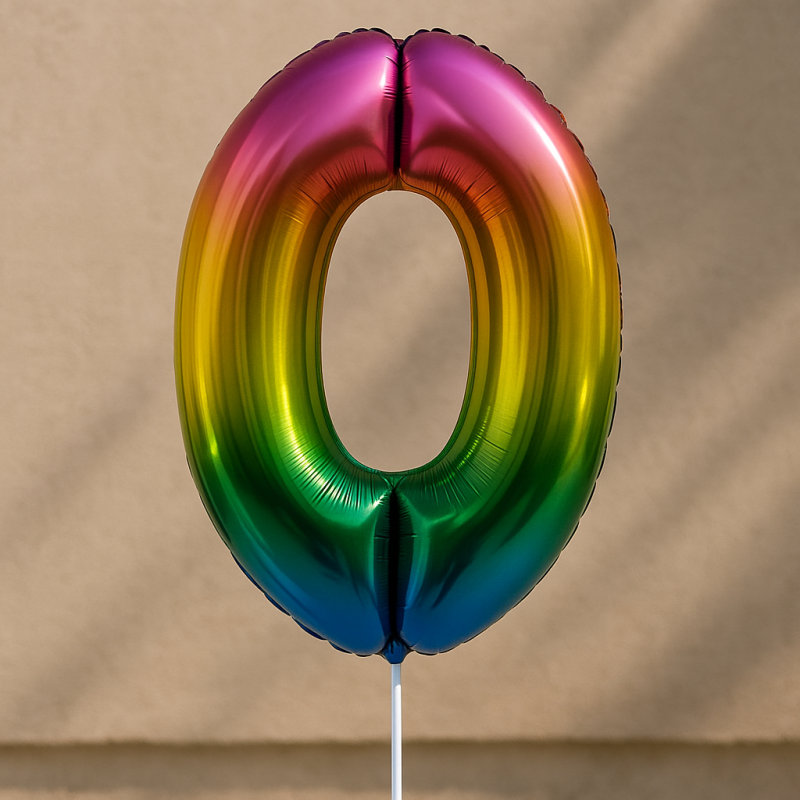 Голям парти балон, изработен от фолио във формата на цифрата 0 в цветовете на дъгата.