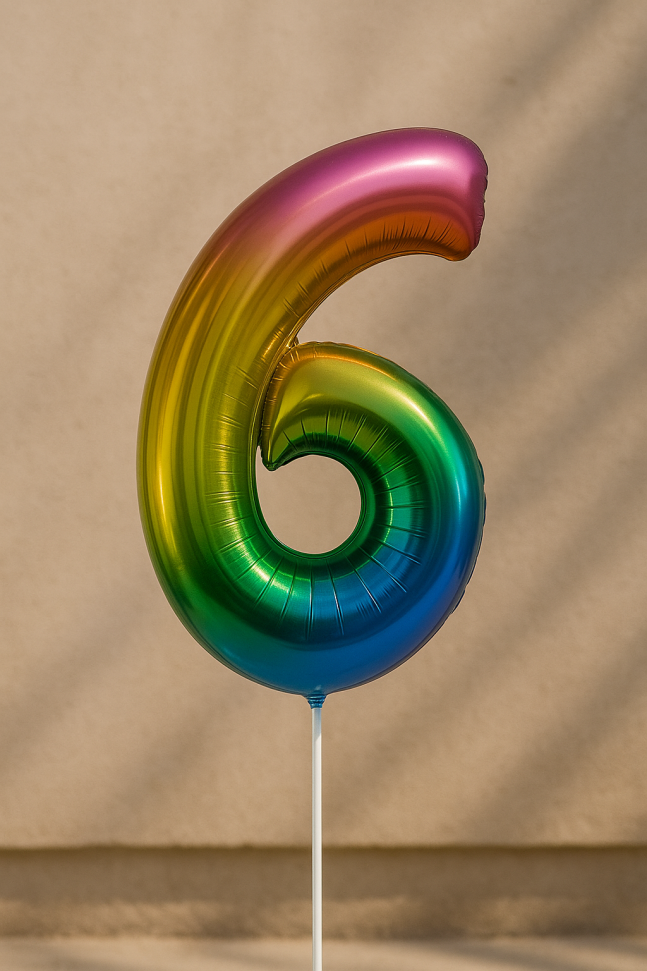 Голям парти балон, изработен от фолио във формата на цифрата 6 в цветовете на дъгата.