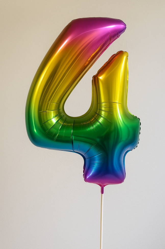 Голям парти балон, изработен от фолио във формата на цифрата 4 в цветовете на дъгата.