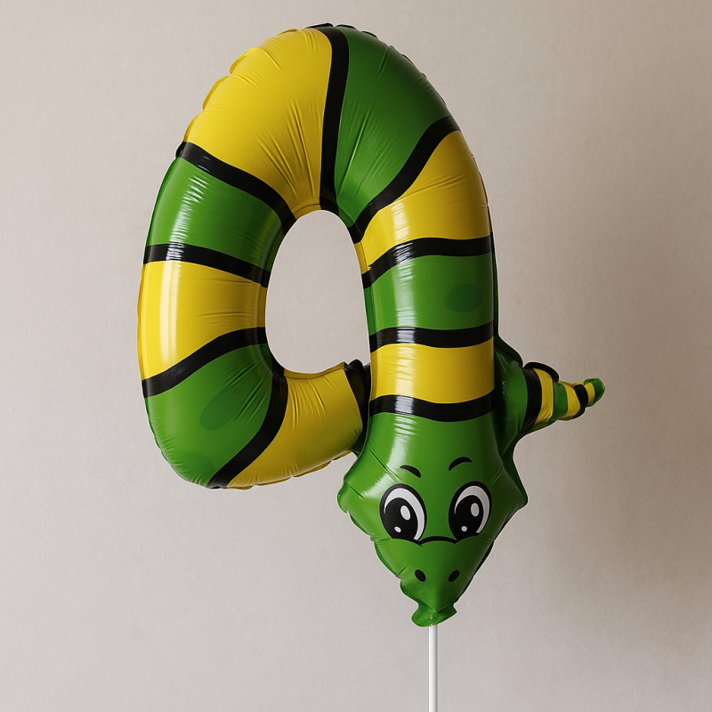 Парти балон цифра 4, изработен от фолио във формата на змия в зелено и жълто.