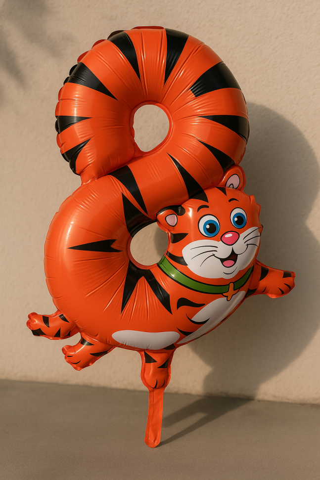 Парти балон цифра 8, изработен от фолио във формата на симпатичен тигър.