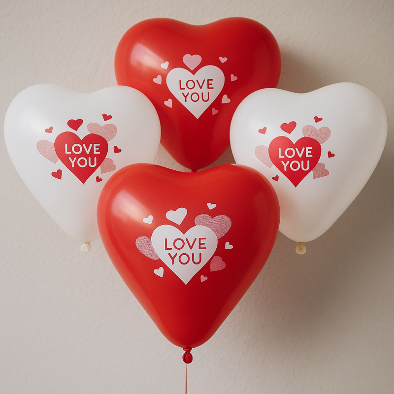 10 броя парти балони, изработени от латекс във формата на сърца в червено и бяло с надпис LOVE YOU.