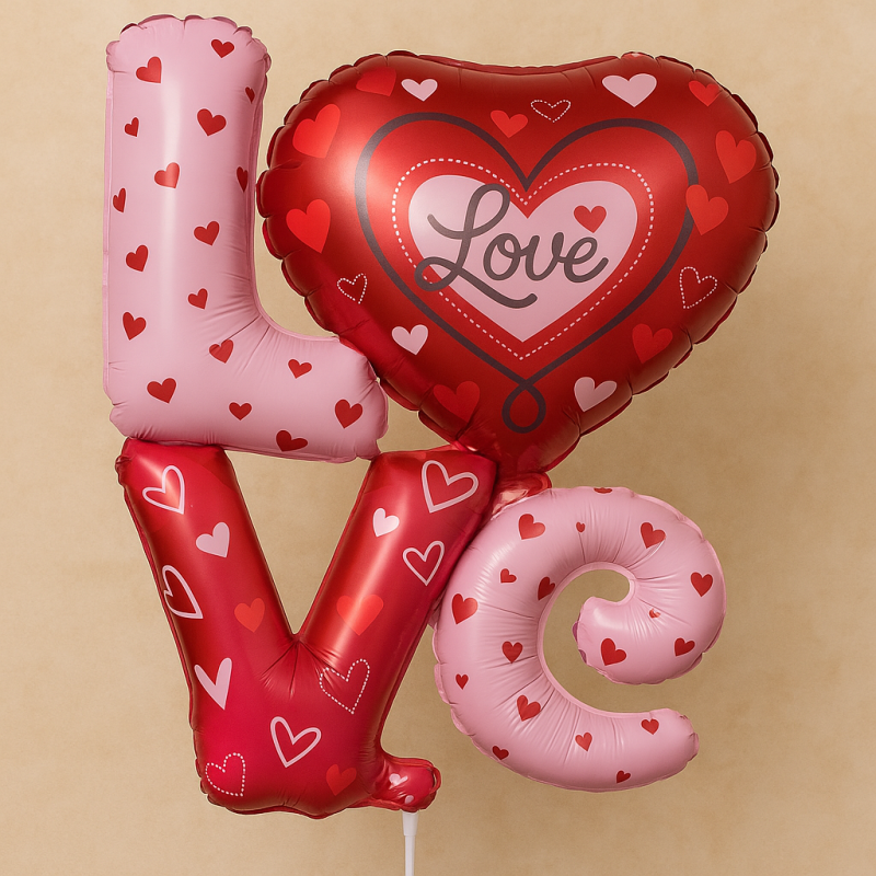 Голям парти балон, изработен от фолио във формата на надпис LOVE в червено и розово.