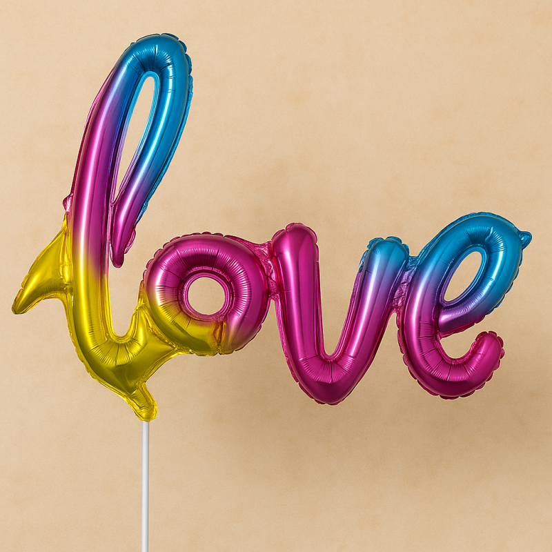 Парти балон, изработен от фолио във формата на надпис LOVE в ярки неонови цветове с металически отблясък.