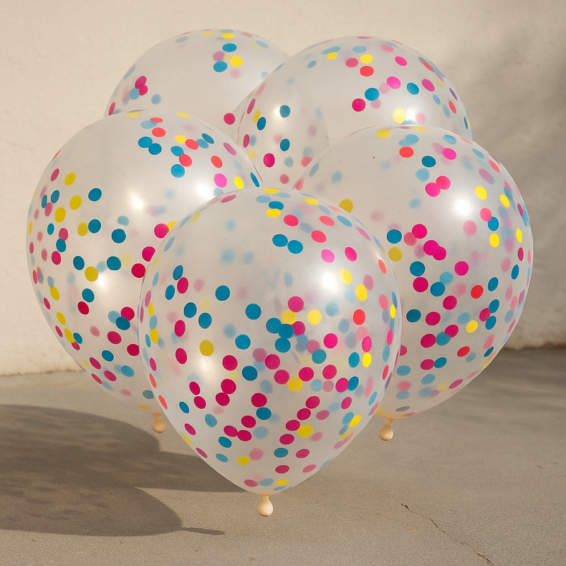 5 броя парти балони, изработени от прозрачен латекс с разноцветни конфети вътре.