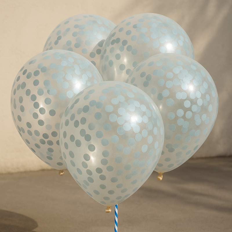 5 броя парти балони, изработени от прозрачен латекс със светло сини конфети вътре.