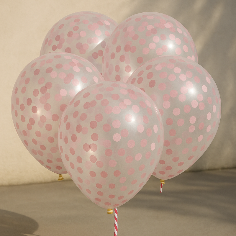 5 броя парти балони, изработени от прозрачен латекс с розови конфети вътре.