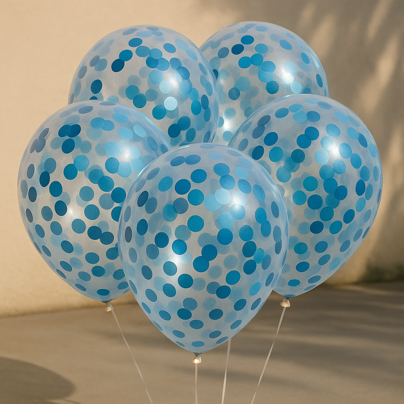 5 броя парти балони, изработени от прозрачен латекс със сини конфети вътре.