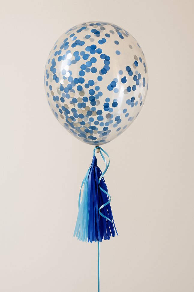 Парти балон, изработен от прозрачен латекс със сини и сребристи конфети вътре и декоративни пискюли.