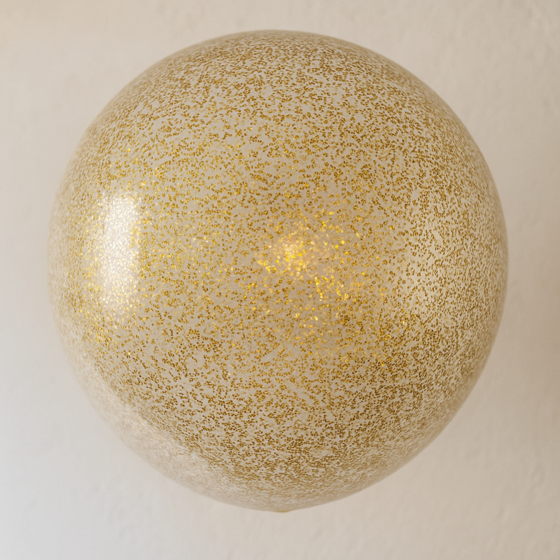 Парти балон със сферична форма, изработен от прозрачен латекс със златисти конфети във формата на звезди вътре.