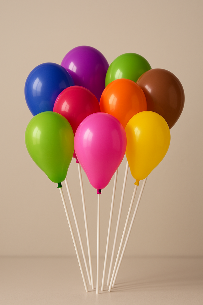 10 броя парти балони, изработени от латекс в различни ярки цветове с дръжки с дължина 38 см.