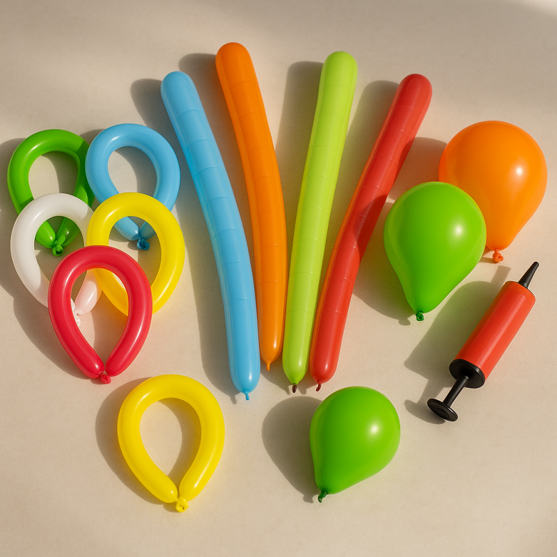 22 броя различни парти балони (10 бр. летящи, 10 бр. за моделиране на фигури и 2 бр. класически), изработени от латекс в ярки цветове в комплект с ръчна помпа.