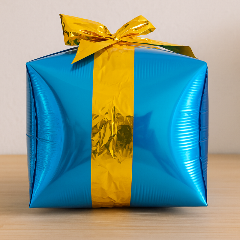 Парти балон, изработен от фолио във формата на подарък в син цвят.