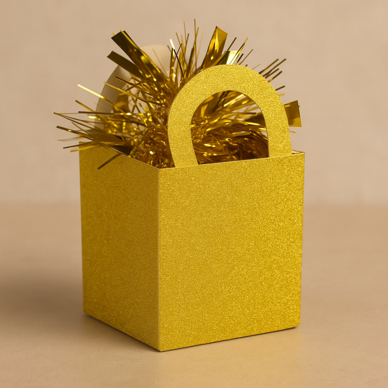 Тежест за балони, изработена от 250 грама цимент в златиста картонена кутия с блестящи брокатени частици.
