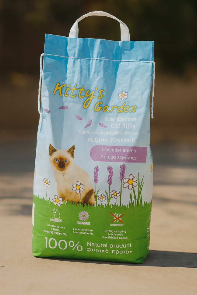 Високоабсорбиращ санитарен пясък, подходящ за котки с аромат лавандула.