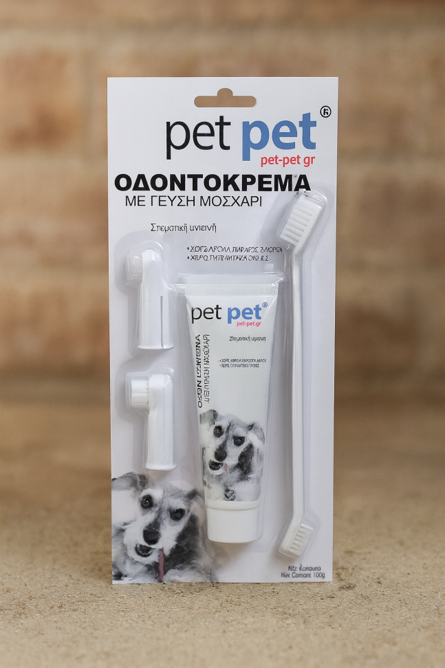 Опаковката съдържа: 1 пластмасова двустранна четка 23 см, 2 малки четки и паста за зъби 100 гр. с вкус на телешко.